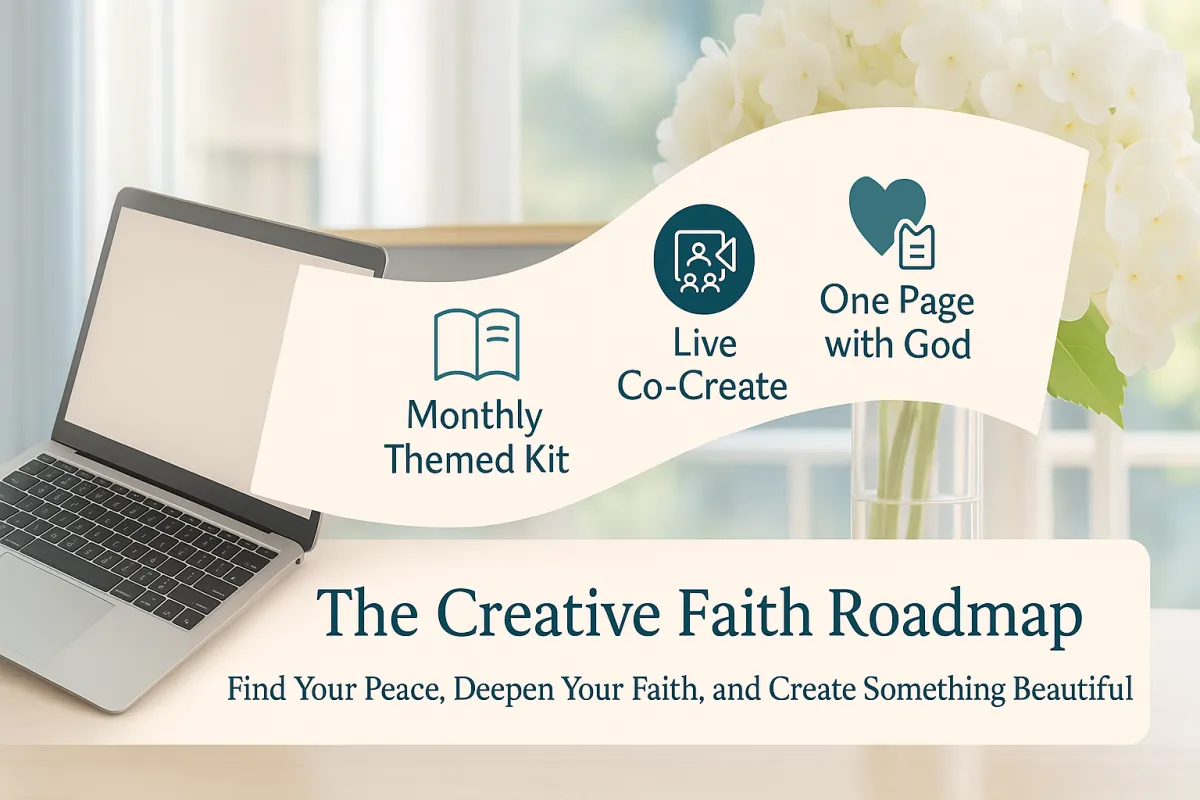 One themed devotional + printable kit (verse/prayer cards, collage papers, Creative Companion Sheet), one 60-min Live Co-Create with replay, and a kind community (Show & Tell, Prayer & Praise).